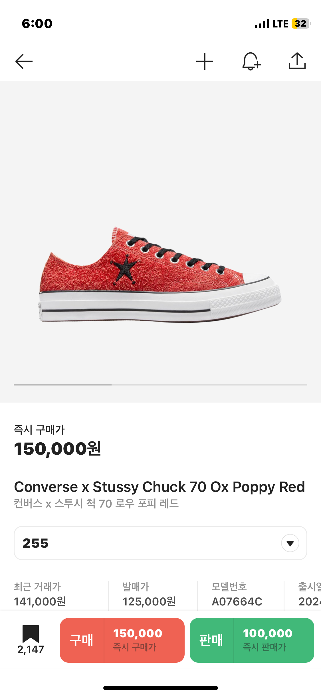 스투시 컨버스 척70 로우 포피레드